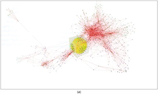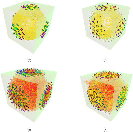 Additionally, we focused on the graph’s edges as an additional source of structural information, including their color, shape, and other features that can be used for edge visualization. Edge coloring can be related to a variety of data-derived features; in our presented version, it is tied to Euclidean distance to improve spatial awareness. Furthermore, this attribute is consistent with the concept of force-directed algorithms in that spatial distance is an internal property of the graph; therefore, no external intervention is required to identify it, and thus the generated algorithm can continue to function in the traditional fashion. In the presented results, the red color indicates a distance of mutual vertices greater than the radius of the resulting visualization (space defined by introduced anchor-controlled placement), the yellow color is used for edges with a mutual distance smaller than the radius and greater than 1/3 of the radius, and the green color is associated with the edges smaller than 1/3 of the radius.