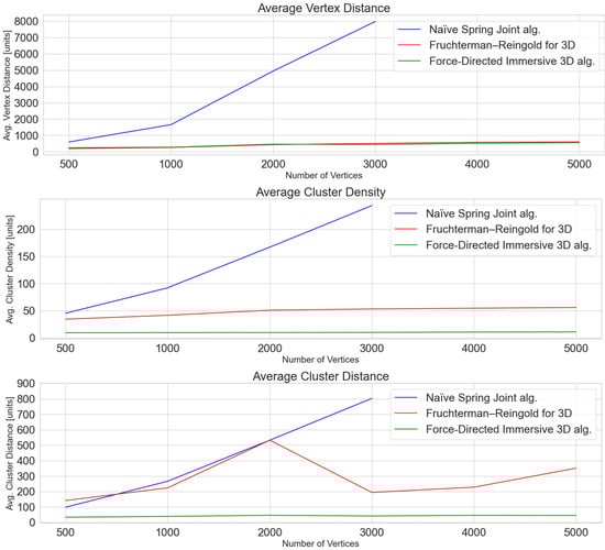 Finally, the third metric, average cluster distance, shows the main difference between Fruchterman–Reingold implementation in 3D and our force-directed immersive 3D algorithm. The clusters created for naïve implementation are sparse, and distances between vertices are large. For Fruchterman–Reingold implementation in 3D, it is possible to see the tendency to create one cluster, and with an increased number of vertices (about 2000), to split results into more clusters and dense newly created clusters again. The force-directed immersive 3D algorithm keeps the distance of vertices within the clusters constant and thus allows fulfilling all needs for good immersive visualization with the user involved inside the created space (between the clusters) with consistent physics and intuitive navigation (motion-oriented approach).