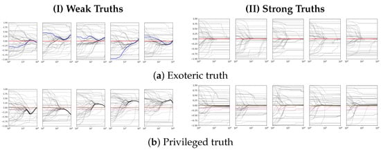 Next, we simulate opinion dynamics in the presence of truth, beginning with scenarios involving weak truth and progressing to those with strong truth for both exoteric and privileged truths. Here, we define weak truth as truths with influence that are similar to a smaller order of magnitude as agent–agent connections, i.e., , for an eligible j. Conversely, strong truth is one where . This simulation is important because it provides insights into how varying degrees of truthful information influence the evolution of public opinion. We first define a central truth to compare the degree of truths, set as , where denotes a vector of zeros of length k.