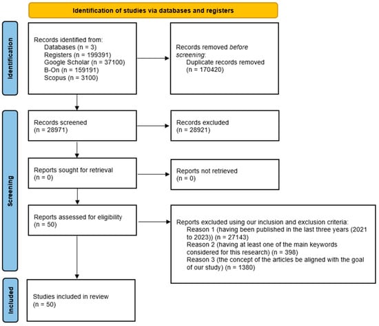 After this selection, we used the Leximancer software to analyze the sections of the articles referred to. This study followed the PRISMA 2020 guidelines, please see Figure 1, which shows the flow diagram for systematic reviews.