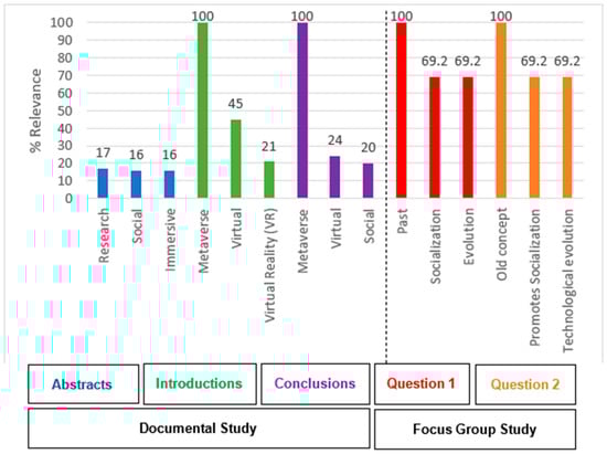 We started to make a comparison by taking into account the three most relevant results from the documental study (abstracts, introduction, and conclusion, corresponding to the first nine columns starting from the left side, in this respective order) and from the focus group study (question 1 and question 2, the remaining six columns in corresponding order) (Figure 2).