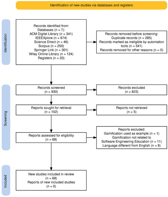 Our research adheres to the guidelines for a Systematic Literature Review (SLR), as described in [8]. This study aims to explore the application of gamification in SEET, covering the literature published from 2015 to 2023, using the PRISMA methodology [7] and useful tools for paper gathering, such as Zotero https://www.zotero.org/ (accessed on 1 June 2024), and for tagging and data extraction, such as Python and Microsoft Excel.
