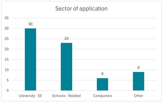 Schools and related educational institutions represent the second most common sector, with 23 studies, 34% of the analyzed papers. This includes primary, secondary, and other non-university educational contexts where gamification is used to make learning more engaging and effective.