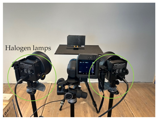 The setup used for experimental active thermography, and on which we based the model, comprises two 1000 W halogen lamps, as shown in Figure 2.