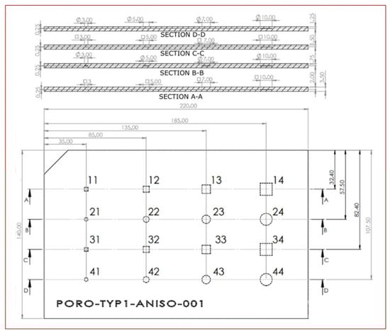 The coupon was created by additive manufacturing using an Anisoprint A4 printer, and its geometry consists of a rectangular plate 220 mm long, 140 mm high, and 2.8 mm thick. It contains 16 internal defects of different sizes and shapes and located at different depths. These defects are intended to reproduce possible delamination or porosity defects in real components. The delimitation of a layer is represented by creating a 250 μm thick void in the benchmark as shown on the plan. The different sizes used in the benchmark give an idea of the resolution of active thermographic inspection. As these are internal defects, only additive manufacturing could be used to produce the real benchmarks. The geometric model of the benchmark used is shown in Figure 3.