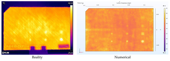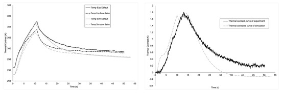 Once the geometric model had been created, we were able to import it into COMSOL Multiphysics 6.2 and create our finite elements simulation. As previously stated, the model developed as part of this research is therefore a complete model. It recreates the entire heat source to take direct account of most of the physical mechanisms that occur during active thermography. In Figure 4, there is a comparison between a thermogram made with the thermic camera and a numerical thermogram made with the software. To show the difference between software and experiment, some examples of contrast curves are shown in Figure 5.
