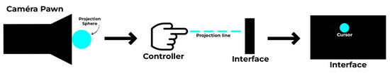 Displacements are also created using teleportation and jerky camera movements to turn around. A cursor system that allows the user to make selections on the interface is added to the program. The cursor is a sphere that is integrated directly into the player camera (named camera pawn) and controlled by the hand. At each moment, an imaginary projection line corresponding to the sphere emanates from the player’s hand. As the user approaches an interface and makes the end of the projection line touch it, the sphere appears and is used to select the desired content. This principle is illustrated in Figure 9.