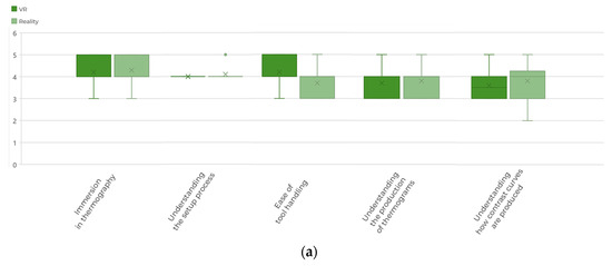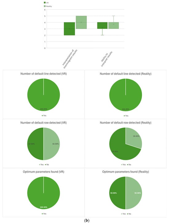 The results of the study showed that most of the students were satisfied with their immersion in the experiment, although they slightly preferred the real experiment (Figure 16a). They understood the setup in the same way, whether it was real or virtual (Figure 16a). As far as manipulation was concerned, the students found it easier to manipulate using virtual reality rather than the experimental setup (Figure 16a). They have encountered an issue with the angle of the lamps that was hard to set up in the reality. This issue is fixed and already setup in VR for each case, which is better. The production of thermograms was generally well understood regardless of the conditions, but the contrast curves were slightly better understood in virtual reality (Figure 16a). The results obtained by thermogram were better understood in experimentation (Figure 16a). Although the number of defect lines found was identical in VR and reality (Figure 16b), for the number of columns, virtual reality provides better accuracy (Figure 16b). Although the interpretation of the results seems simpler after the real experiment (Figure 16b), 100% of the students managed to find the correct optimal parameters at the end of the virtual experiment, whereas only 50% did so after the real experiment (Figure 16b).