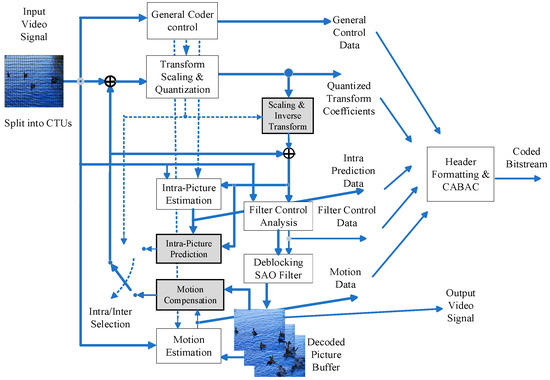 There are 35 intra prediction modes integrated within the codec. HEVC uses two types of transform coding: Discrete Cosine Transform (DCT) of type II (DCT-II) and Discrete Sine Transforms of type VII (DST-VII). The sizes of the transformation blocks range from 8 × 8 to 16 × 16 to 32 × 32 [24]. Encoder design features two loop filters, each optimized for a different aspect of video encoding. The first is the deblocking filter, which has the primary purpose of reducing compression-induced blocking artifacts. The second filter is called the Sample Adaptive Offset (SAO) filter, and it is used to eliminate artifacts caused by video coding’s transform and quantization processes [25]. HEVC standard uses Context Adaptive Binary Arithmetic Coder (CABAC) as the only entropy coding technique. CABAC can greatly improve compression efficiency through an arithmetic coding approach. Nonetheless, CABAC implementation is intricate and has its drawbacks, including a decrease in processing speed and increased hardware costs [26].
