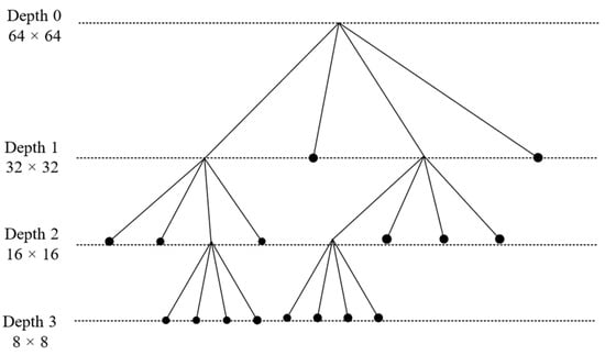 HEVC divides video frames into a hierarchy of Coding Units (CU), as shown in Figure 2 [23]. The hierarchical structure organizes video frames into progressively smaller and more localized units for compression purposes. A Coding Tree Unit (CTU) is comprised of a rectangle picture area containing N × N samples of the luma component and its associated chroma components. The encoder has the ability to select the CTU sizes based on its specific architectural features and the requirements of the application environment. These limits may include memory requirements and constraints on latency. The bitstream contains a signal indicating the value of N, which can be either 64, 32, 16, or 8.