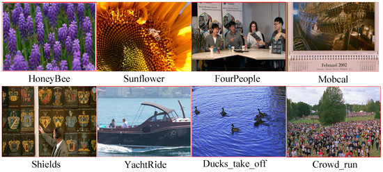 We selected a set of eight video sequences with a range of resolutions and motion activity commonly encountered in multimedia applications. Figure 5 shows a snapshot of these sequences. The dataset is composed of versatile Full HD (1920 × 1080) and High-Definition (1280 × 720) test video sequences. These natural sequences were captured either at 120, 60, 50, or 25 frames per second (fps) and stored online in raw 8-bit 4:2:0 YUV formats. The dataset is characterized by spatial and temporal perceptual information, coding complexity, and rate–distortion behavior [37]. One dataset is published online [38] under a non-commercial Creative Commons BY-NC license. The other dataset is also publicly accessible with appropriate copyright information included [39]. Snapshots of these sequences are shown in Figure 5.