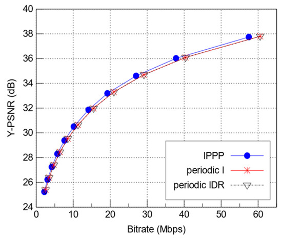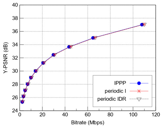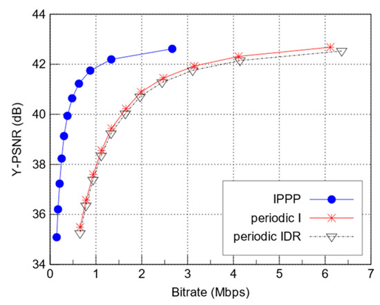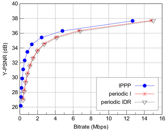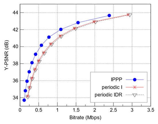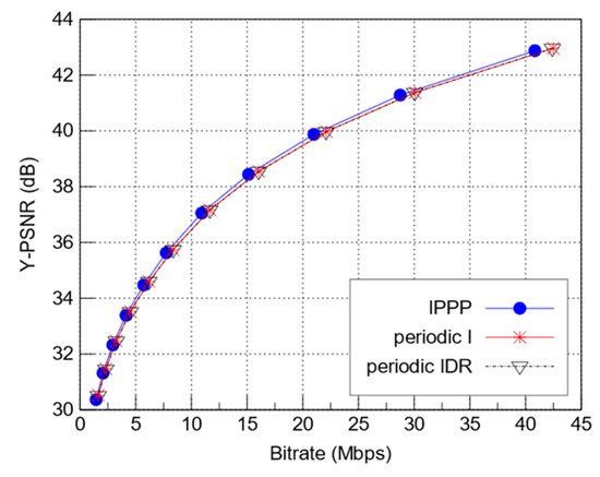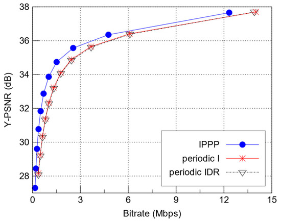 Rate–distortion curves for the test sequences with intermediate motion activity (Mobcal, Shields) show that the IPPP coding configuration can achieve a reasonable quality improvement over periodic-I and periodic-IDR configurations. Additionally, periodic-I shows a slight coding improvement over the periodic-IDR.