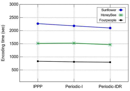 To check the complexity of encoding and decoding different video configurations, we encoded Sunflower, HoneyBee, and FourPeople test sequences using IPPP, Periodic-I, and periodic-IDR coding configurations. The sequences were encoded using QPs of 30, 32, and 27 consecutively to achieve an average PSNR of about 40 dB. The results of encoding times are shown in Figure 18, while Figure 19 shows the results of decoding times. Encoding times are almost not changed for different coding configurations except for the Sunflower sequence, which needs more time to encode the IPPP configurations than periodic-I and periodic-IDR configuration. Looking at Figure 19, it is clear that the decoding time for the IPPP coding configurations is less than that of the periodic-I and periodic-IDR configurations. The reason is that for the same video quality, periodic-I and periodic-IDR configurations use more bitrate than IPPP (Figure 10, Figure 11 and Figure 12). Increased bitrate needs more processing, which increases decoding times.
