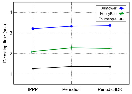 For the same quality video, IPPP uses fewer bits than periodic-I and periodic-IDR configurations. Therefore, the decoding time for the IPPP coding configurations is slightly less than that of the periodic-I and periodic-IDR configurations.