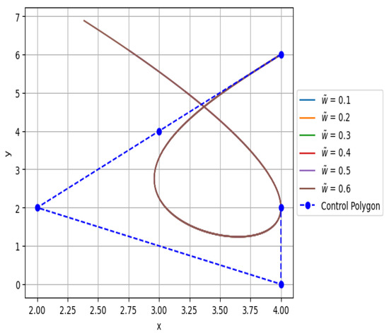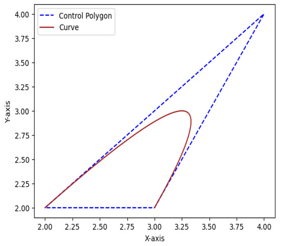 The convex polygon whose vertices are the control points forms the convex hull. When a Bezier curve is used, the entire curve is included within the convex hull; however, when a Caputo Fabrizio Bezier curve is used, the curve falls partially outside the convex hull (see Figure 4 and Figure 5).