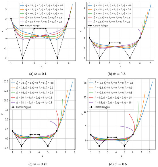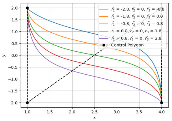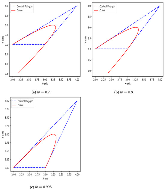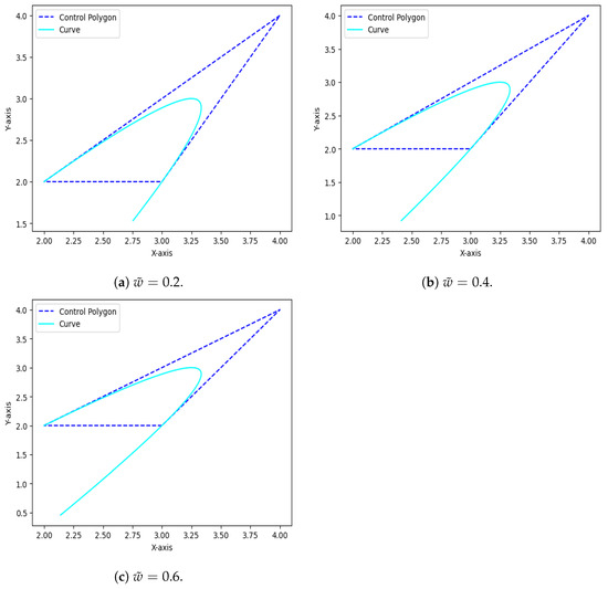 The option of a curve to modify its shape while maintaining the properties of a conventional Bézier curve and not requiring modifications to its management points has led to a notable increase in the use of shape preservation parameters in CAGD in recent times. Without changing control points, shape parameters are essential for modifying the physical shape of Caputo Fabrizio Bézier curves. The degree of the Caputo Fabrizio Bézier curves is determined by the number of shape parameters it possesses. For example, quartic and quintic Caputo Fabrizio Bézier curves have four and five shape parameters, respectively. Normally, two parameters are associated with the center of the shape, and one parameter is associated with its end. As a result, two control points are linked to one parameter. For , a shape parameter is often associated with the and control points. The curve will converge towards as increases. In Figure 8, shape parameter is linked to and ; the shape parameter is linked to and , and the form parameter is linked to and control points. As rises in value, the curve will move in the direction of point . The result will be the same for and .
