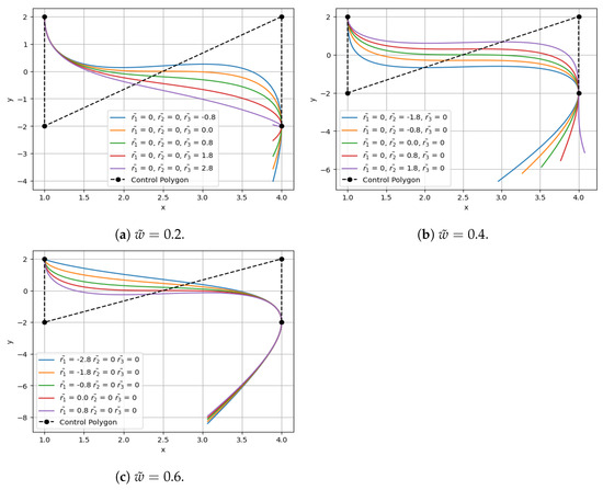Compared to a conventional Bézier curve, the endpoint of a Caputo Fabrizio Bézier curve for is not defined by its last control point. This indicates that the parameter determines the endpoint of the Caputo Fabrizio Bézier curve at . It is simple to compute the location of the endpoint terminal at by inserting the value of in (11). When varies, this endpoint terminal characteristic for the Caputo Fabrizio Bézier curve will give the tractable particle path.