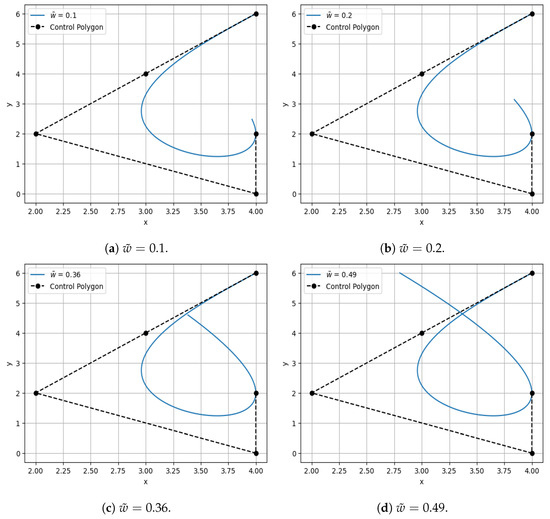When there are a larger number of control points and they are situated in close contact with each another, the length of the curve becomes gradually difficult to manage; if we attempt to lengthen the curve by modifying the control points, the continuity and smoothness of the curve are affected. The fractional parameter is presented as a solution to this problem. Keeping the control points the same, the length of the Caputo Fabrizio Bézier curve is controlled by its fractional parameter. While retaining the essential features of a Bézier curve, engineers can design the required curve with greater flexibility in length and shape by using the fractional parameter . Figure 10a–d demonstrate how we can lengthen the curve using a fractional parameter without altering the control points. Figure 11 illustrates how the curve’s length can be increased at various values of the fractional parameter while maintaining the same path and control points. The length of the curve is increased when (see Figure 5) and decreased in the range (see Figure 6).