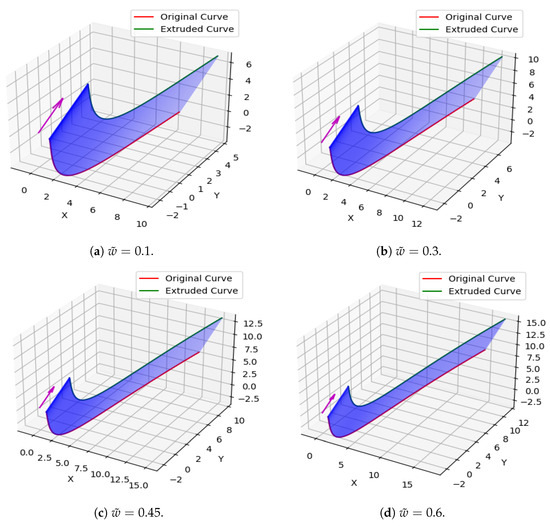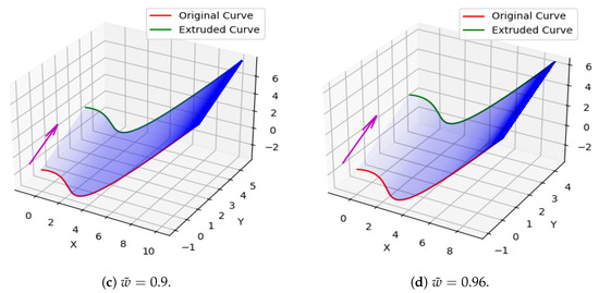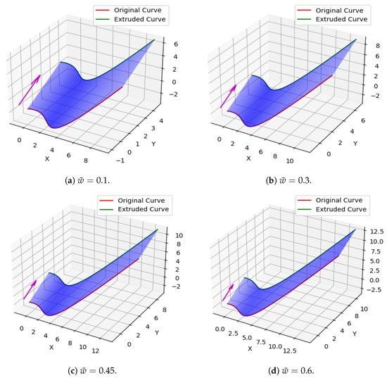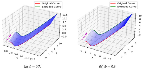 Take , , , and . The surfaces are generated and displayed in Figure 14, Figure 15 and Figure 16 using (13) and the vector for extrusion.