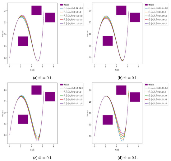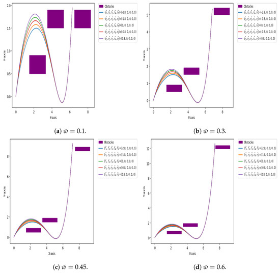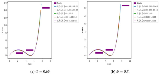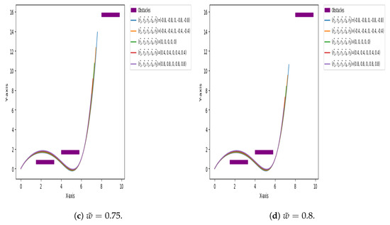Paths that navigate around obstacles, created using quintic Caputo Fabrizio Bézier curves at , , , and (fractional parameter) and different values of shape parameters , , , , and .