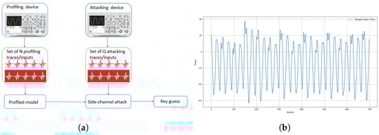 The architecture flow for profiling side-channel analysis and a sample power trace. (a) The profiling side-channel analysis. (b) Simple Power Trace.