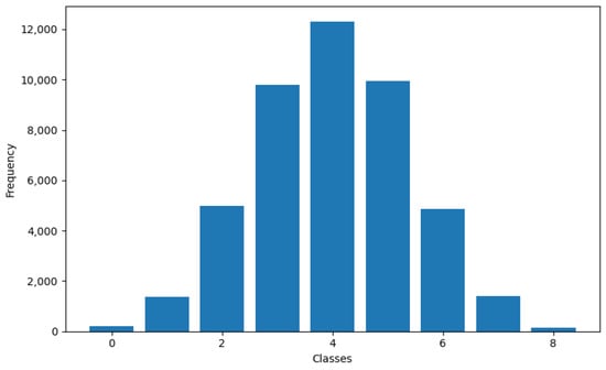 The dataset imbalance is a prevalent issue in profiled side-channel analysis. Using leakage models such as the Hamming weight (HW) often results in an imbalanced dataset [,]. This imbalance comes from the calculation of bit transitions by the HW model from 0 to 1 []. For example, in an eight-bit number, there exist eight different configurations with an HW of 1 (a single bit set to 1), while only one configuration has an HW of 8 (all bits set to 1). This pattern extends to the HW values between 1 and 7, resulting in their over-representation compared to the hamming weight of 0 and 8.