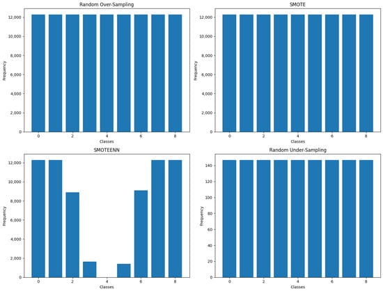 The Synthetic Minority Oversampling Technique (SMOTE) is a well-established oversampling method designed to address class imbalance in datasets [,]. It works by generating synthetic samples for minority classes, effectively augmenting their representation.