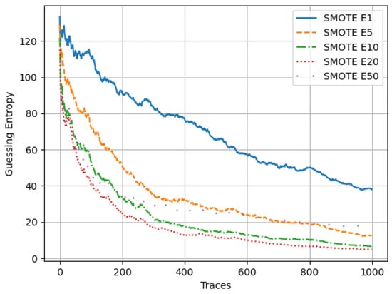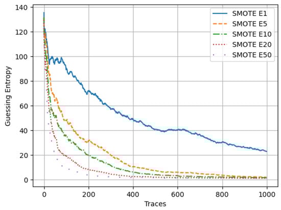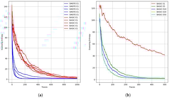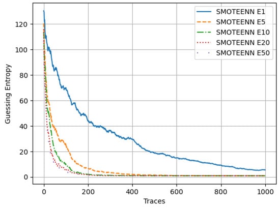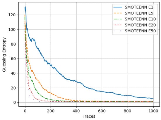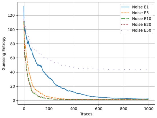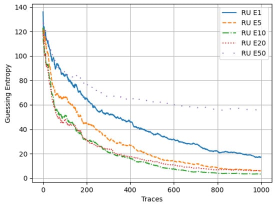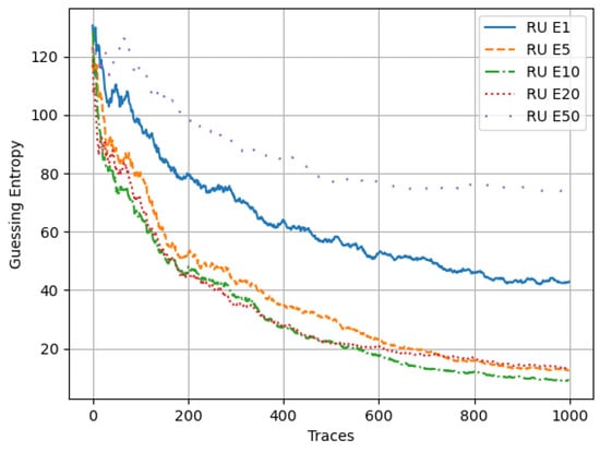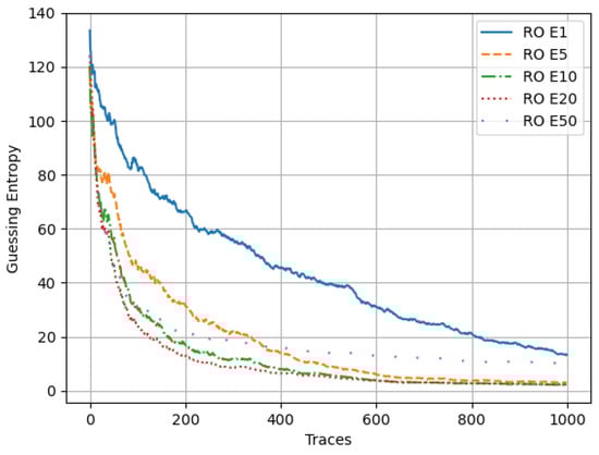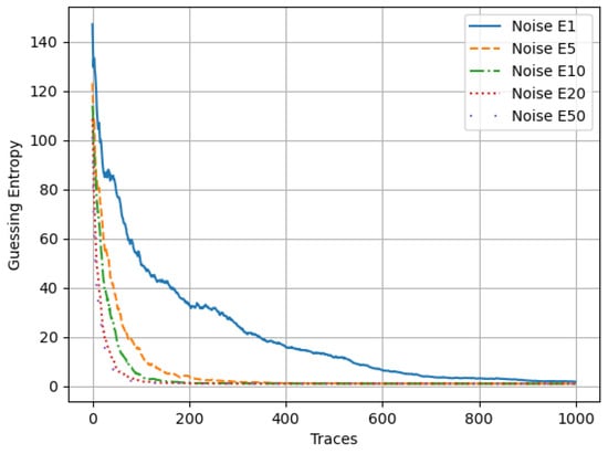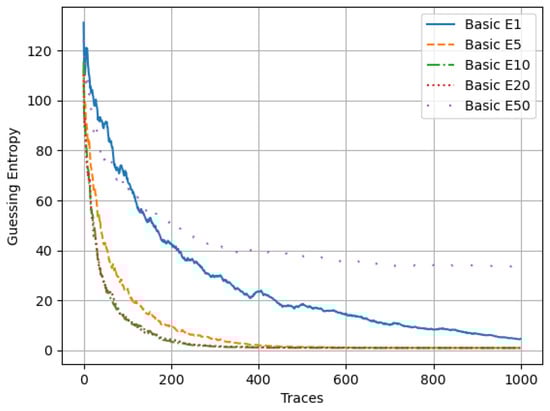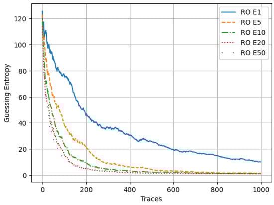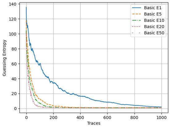 In SCA, guessing entropy (GE) provides a rigorous metric to quantify the effort required by an adversary to correctly identify the secret key []. It represents the average number of key candidates that an attacker must explore after conducting an SCA attack. The overarching aim of SCA is to correctly distinguish the secret key within a manageable number of traces, minimizing computational overhead. After analyzing each trace, the keys are ranked in descending order of probability. GE, therefore, reflects the average ranking of the correct key among these ordered probabilities across multiple experiments (or analyzed traces). Due to its reliability, GE is a widely adopted performance metric in side-channel research.