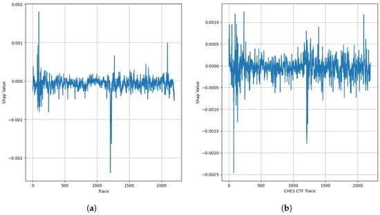 From all the plots provided, Figure 17a depicting the ensemble of one model displayed the fewest number of peaks at 3, indicating minimal participation of the traces in the model output prediction. With an increase in the number of models in the ensemble, the number of peaks in the plots also increased, signifying a greater contribution of side-channel traces. Notably, the ensemble of 20 models in Figure 17b demonstrated the most balanced performance, with eight peaks and the highest peak at approximately . Thus, the Shapley values plot aligns with our previous findings and establishes the additional benefit of employing an ensemble of machine learning models in SCA attacks.