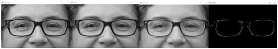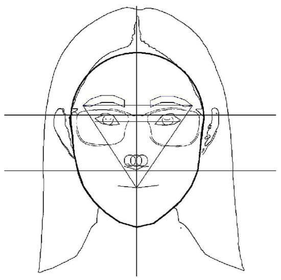 For the eyeglass in the image, first, we extract a specific area from the grayscale image as the Region of Interest (ROI) for the eyeglass [18]. Then, we apply mean filtering to blur the extracted eyeglass region to smooth the image. After blurring, we dilate the image to highlight the frame of the eyeglass. Finally, we use the Canny algorithm to detect and identify the edge of the eyeglass. Figure 4 shows an example of generating auxiliary lines for the eyeglass.