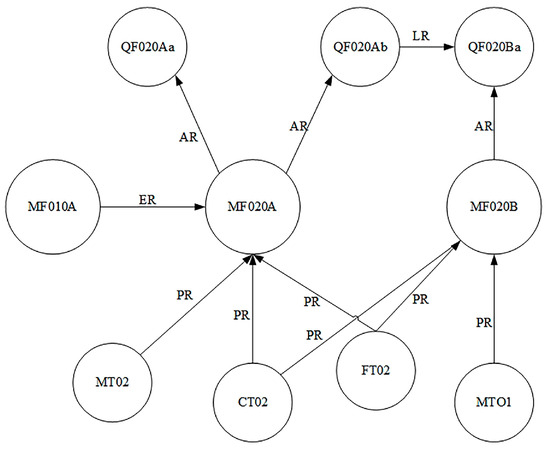 where represents the collection of nodes of different processing elements in the workpiece processing process. represents the collection of nodes of processing features obtained from the decomposition of the workpiece processing process. represents the collection of nodes of quality features output from the workpiece processing features. denotes the set of directed edges in the workpiece machining process network between machining qualities or machining qualities, machining elements of the role of the relationship between the set of directed edges. According to the above definition of the machining process, network nodes and edge relationships can be established as shown in Figure 1, machining process sub-network.