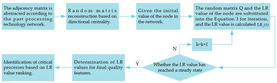 The original LR algorithm is constructed only by the out-degree of the nodes, and the background nodes are calculated iteratively using a uniform distribution. This method ignores the influence of the node’s in-degree on the system and the influence of the correlation between the nodes, which sometimes leads to a significant error. Similarly, the importance of the network nodes directly affects the machining process network. Suppose the weights of the background nodes are uniformly assigned. In that case, they may not reflect the network structure’s intrinsic connections and information flow, thus reducing the algorithm’s accuracy. In order to avoid the limitations of a single structure and uniform allocation, this paper makes it more reasonable by reconstructing the random matrix Q and redistributing the weights of the background nodes in proportion to the LR values of the nodes in the stable state of the network. The improved LR algorithm is used to identify the critical process flow, and its specific steps are shown in Figure 2.