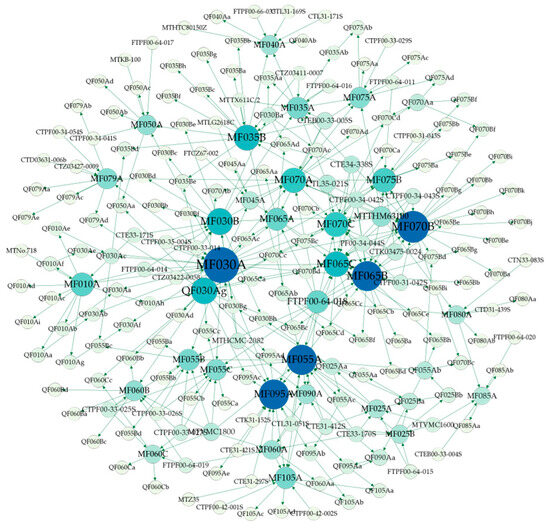 In order to intuitively and accurately locate the critical processes, it is necessary to establish sub-networks by the machining sequence between the machining qualities of the connecting rods and merge them to form a complete machining process network model. Iterative calculations are performed according to Equations (2) and (3) until convergence to a stable value to obtain the final LR value of each node in the network. The connecting rod machining process visualization network is reconstructed according to the size of the LR value of each node. As shown in Figure 4, the size of the network nodes represents the size of the LR value, and the more significant the network node, the darker its colour and the higher its influence.