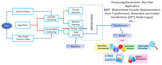 Current-generation computers are used for process automation, intelligent decision-making, mimicking behaviors by robots, and using transformers to generate text, images, and videos [15,16,17]. Figure 1 shows process automation executed by an algorithm operating on data structures. Insights obtained through machine learning algorithms or deep learning algorithms for intelligent decision-making are derived from data analytics, as shown in Figure 1. In addition, deep learning algorithms (which use multi-layered neural networks to simulate the complex pattern recognition processes of the human brain) are used to perform robotic behaviors or generative AI tasks.