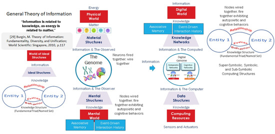 Figure 2 depicts [23,24,25,26,27,28,29] how information bridges the material world of structures formed through energy and matter transformations; the mental world that observes the material world and creates mental structures that represent the knowledge received from observed information; and the digital world created using the information generated by both the mental and material structures using the stored program control implementation of the Turing machine.