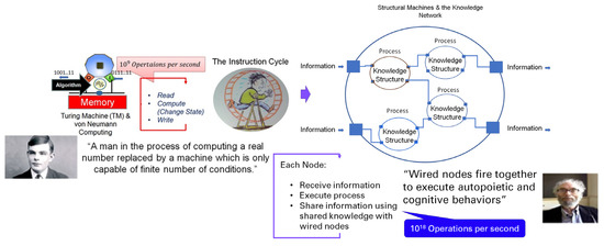 This image illustrates the evolution from traditional computing models to more advanced structural machines and knowledge networks suggested by GTI. The Turing machine-based computing model was derived from the observation that “A man in the process of computing a real number replaced by a machine which is only capable of a finite number of conditions”. The computing model with structural machines and knowledge networks is derived from the observation that “Nodes wired together fire together in a knowledge network to exhibit autopoietic and cognitive behaviors”.