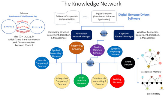 This figure depicts entities, relationships, and behaviors of autonomous distributed system components constituting a knowledge network. The digital genome provides the core framework that integrates various software components to form a cohesive system with specific functional and non-functional requirements, as well as best-practice-based policies. The autopoietic network manager ensures the deployment of the computing structures and maintains structural stability. The cognitive network manager manages the cognitive process workflow ensuring information flow within the knowledge network.