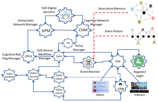 This figure depicts the architecture of a video-on-demand (VoD) system driven by a digital genome specification described in the paper and demonstrated in the video, integrating various components to manage and deliver video content efficiently while leveraging associative memory and event history for improved functionality.
