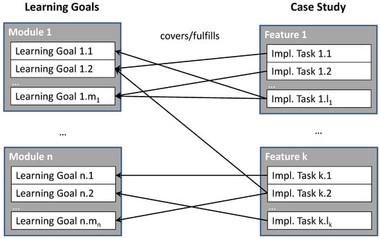 A case study solution (right side of Figure 1) consists of multiple functional features of an implemented product. Each of these features is implemented by solving a sequence of implementation tasks. A task is a specification of some implementation goal that has to be achieved by a student to continue in the case study, e.g., “perform empty game field generation” or “shuffle the field items randomly”. Each implementation task covers and fulfills one or more learning goals. Each goal can be covered by multiple tasks. If there is a goal that is not covered by any task, we risk that the goal material will not be exercised in full and therefore not be comprehended well.