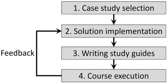 The lifecycle starts with the case study selection phase. In this phase, the authors need to find a suitable theme and project that is appropriate for the course. The selected project should offer enough space to fulfill the learning goals. After the selection phase, we suggest starting with the design and implementation of a solution to refine our understanding of the details and find potential problems. The solution implementation phase is followed by the writing study guides phase. After the study guides are finished, it is time to run the course. During the execution, it is essential to collect feedback from the students and subsequently include the suggestions and observations in the study materials and update the implemented solution.