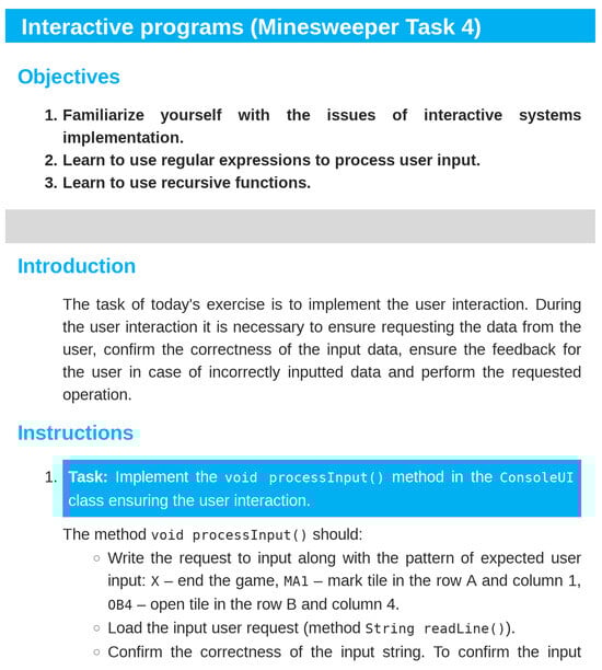 The tasks represent the main component of the study guides—each lesson should have at least one task. However, they are not the sole content of them. Besides the tasks, the study guide for each lesson provides the students with a problem definition and explanation of the problem context, objectives of the corresponding lesson, background, reasoning, further reading, etc. These concepts will be explained in the rest of the paper.