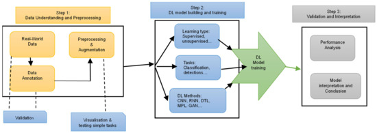 DL models have an advantage over traditional machine learning models due to the increased number of learning layers and a higher level of abstraction. One more reason for this advantage is that there is direct data-driven learning for all model components. DL is quite data-hungry, given that it includes representation learning [35]. A well-behaved performance model for DL requires an enormous quantity of data, and it requires more data than traditional machine learning algorithms. Machine learning may be utilized with as few as 1000 data points, but DL often needs more data points [36,37]. See Figure 1, which shows a typical architecture of a DL workflow. A summary of other related works is shown in Table 1.