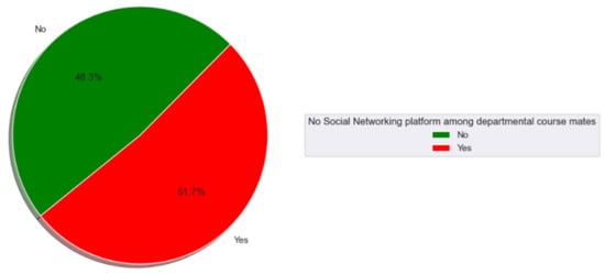 Figure 5 shows that 51.7% abandoned their study due to lack of the use of a social network platform to communicate with their departmental course mates, while 48.3% was not due to lack of the use of a social network platform. This suggests that social networking platforms are a popular way for students to stay connected with each other and share information.
