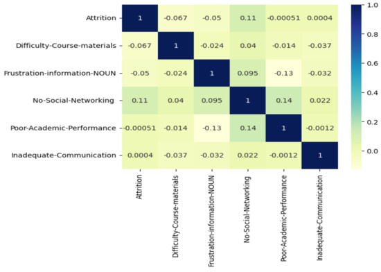 Figure 11 shows a correlation matrix of the factors affecting students’ attrition. The Pearson correlation coefficient was reflected on every pair of factors. There are three possible correlation coefficients: -1 for a perfect negative correlation, 0 for no correlation, and 1 for a perfect positive correlation. The strongest positive correlation is between poor academic performance and no social networking (r = 0.14). This means that students who had poor academic performance were more likely to drop out of the course due to social networks. Other significant positive correlations include difficult course materials and no social networking (r = 0.11). This means that students who found the course materials difficult or who were frustrated with not knowing about social networking provided by the university were more likely to abandon their studies.