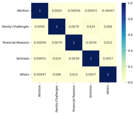 Figure 12 shows a correlation matrix between different reasons for attrition for non-institutional challenges. The values in the cells represent the correlation coefficient between two reasons. A positive correlation coefficient indicates that two reasons are positively correlated, meaning that if one reason increases, the other reason is also likely to increase. A negative correlation coefficient indicates that two reasons are negatively correlated, meaning that if one reason increases, the other reason is likely to decrease. The strongest positive correlation is between financial reasons and others (0.012). This means that if a student is facing financial reasons for attrition, they are also likely to be facing other reasons for attrition. The strongest negative correlation is between attrition and family challenges (−0.0005). This means that if a student is facing family challenges, they are less likely to be facing attrition.