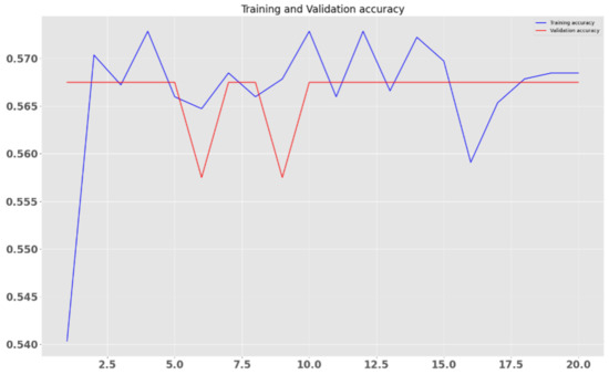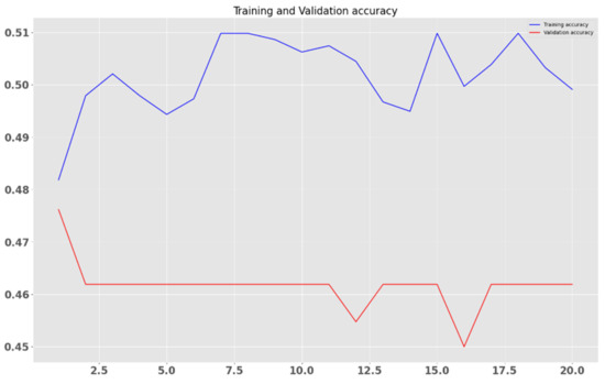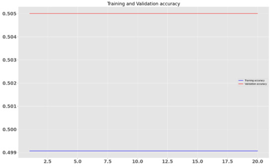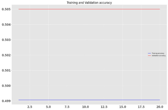 The CNN model’s accuracy during training and validation is displayed in Figure 19. The model’s accuracy on training data is known as training accuracy, and the model’s accuracy on validation data is known as validation accuracy. Because the validation data are usually harder to analyze than the training data, the validation accuracy is typically lower than the training accuracy. About 50.5% the training and 49.9% of validation accuracy are found in this study.