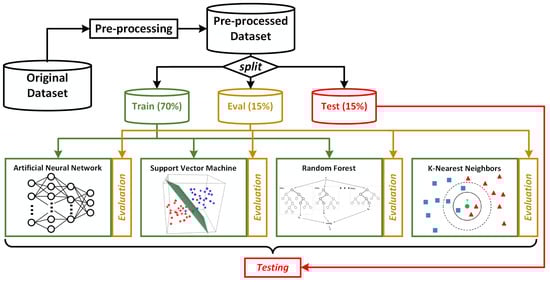 Graphical abstract showing the dataset split into training (green, 70%), evaluation (yellow, 15%), and testing (red, 15%) phases. Multiple algorithms are trained and evaluated using the training and evaluation sets, while the testing set is used for final model performance assessment. abstract for the full processing chain.