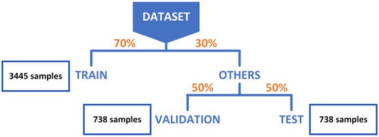 Finally, the training subset represents 70% of the original dataset. Next, the remaining data are split into validation and test sets, using 50% for each one: this means that both the validation set and the test set represent 15% of the original dataset. Figure 4 graphically represents the partitioning of the dataset that has been performed using the hold-out technique.