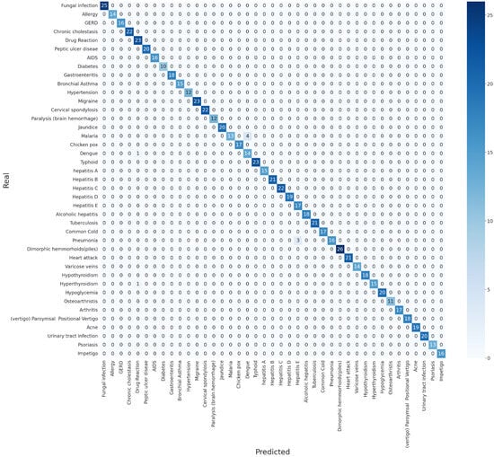 The final work compared is the one developed by Nesterov et al. []. The results obtained in this work seem better than those obtained in this study, as the dataset used for that work varies by between 5 to 10 times the size of the dataset used here. More specifically, for the dataset of 200 illnesses, it obtains a 96.5% accuracy (while our work obtains a 99.19% for a 41-illness dataset).