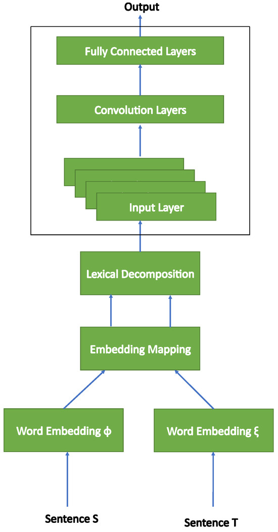 We use a word-embedding scheme to create a vector representation of each word appearing in a sentence. In word embedding, a d-dimensional vector is used to represent each word or with a pre-trained neural network [60]. Some of the commonly used embedding schemes are Word2Vec, GloVe, FasText, etc. The Word2Vec uses skip-gram or the Continuous Bag of Word model (CBOW) for the embedding. A d-dimensional embedding process generates a matrix of dimension for a sentence with n words. We apply this scheme to both sentences and to obtain the word embedding of both sentences in matrix form. Each and represents the word-embedding vector in d-dimensional space. The pre-trained embedding models can be of two types: (i) the monolingual embedding and (ii) the cross-lingual embedding. In monolingual embedding, the model is trained on a dataset containing text from a single language, whereas in cross-lingual embedding, a dataset containing a parallel corpus with or without word alignment is used to train the model [61]. In our experiment, we explore both monolingual embedding and cross-lingual embedding for sentence representations. The processed texts are embedded into a 300 d vector using pre-trained word-embedding models. The English sentences are embedded using the tok2vec model available in Spacy library [62]. Similarly, the Kannada text is embedded using fasttext [63]. It uses the skip-gram model with default parameters as described in [64] for Kannada word embedding (the pre-trained word embedding for Kannada is available at https://fasttext.cc/docs/en/pretrained-vectors.html (accessed on 10 June 2024). The method presented in [64] uses a subword representation using character n-grams, thereby enabling the efficient representation of morphologically rich texts.